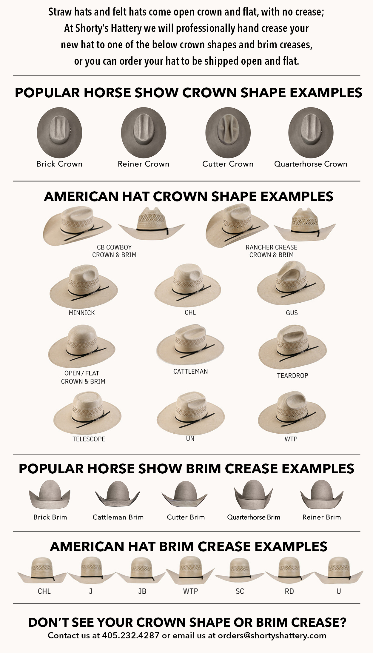 The American Hat Co. Straw Hat 6200 is the perfect blend of classic western style and modern craftmanship, ideal for any cowboy, this high quality hat offers durability, comfort, and a timeless look. The price includes custom shaping to the crown shape and brim crease you choose. Visit our HAT SHAPE OPTIONS page or click the button below to see available options. If you do not see “your” hat shape give us a call! You can also add edge binding for a special finished look on your felt hat. Binding comes in black, brown or creme. If you are looking for a different color of binding contact our store at 405.232.4287 for available options. If you need to reset your option choices click the