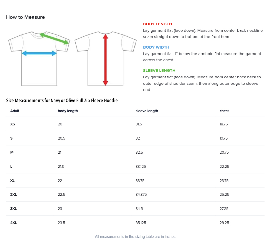 Size Chart for Navy or Olive Hoodie